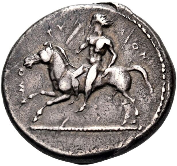 Опис: Оголений юнак, який готується зістрибнути з коня, що мчить ліворуч, тримаючи поводи правою рукою, утримуючи рівновагу лівою рукою, спираючись на спину коня, і всім тілом на лівому боці коня.