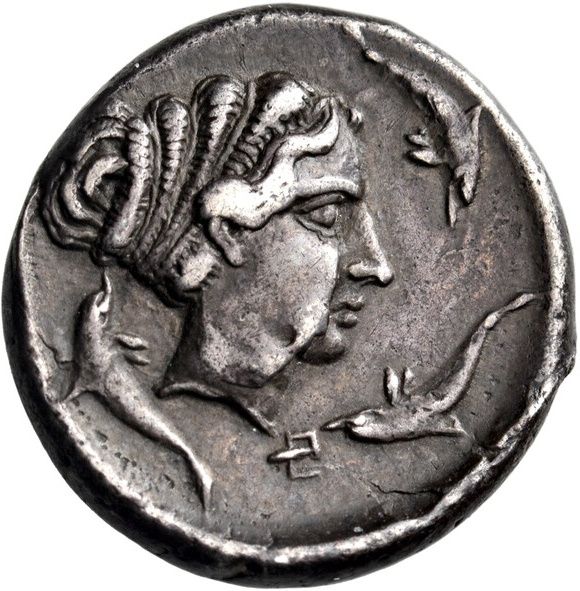 Опис: Жіноча голова праворуч, з пов'язаним волоссям; навколо — три дельфіни, що плавають за годинниковою стрілкою; під шиєю — 𐤇 (= пунічний Ḥ).