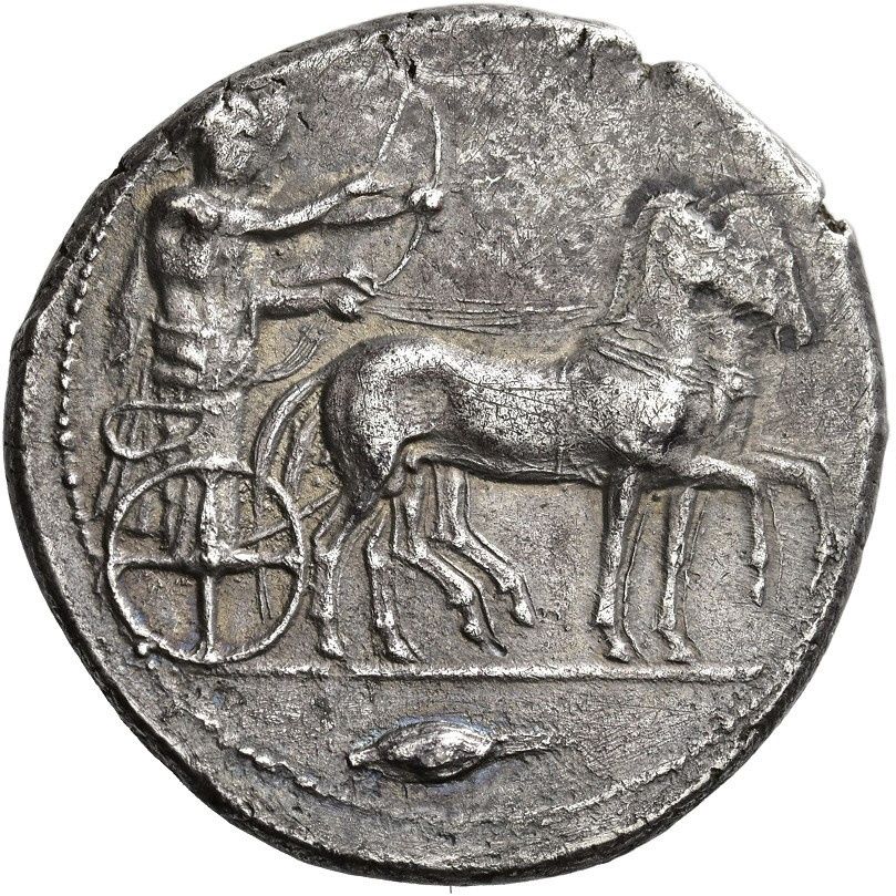 Опис: Повільна квадрига, керована Артемідою, яка тримає віжки в обох руках; поруч з нею Аполлон стріляє з лука; в екзергу — ячмінне зерно.