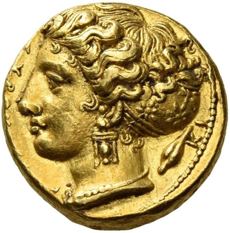 Опис: Голова Аретузи ліворуч, волосся вишукано зачесане і зібране ззаду у сфендоні, прикрашене зіркою, на шиї намисто, штанга та потрійні сережки; за головою — ячмінне зерно та підпис KI.