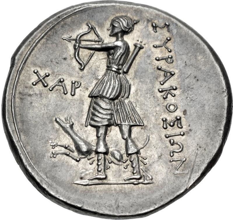 Опис: Артеміда стоїть ліворуч, натягуючи лук; збоку — собака, що стрибає ліворуч; XAP ліворуч, ΣYPAKOΣIΩN праворуч.