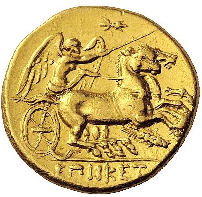 Опис: Ніка, тримаючи батіг у правій руці та віжки в лівій, керує бігою, що мчить праворуч. Зверху — блискавка, знизу — колос зерна.