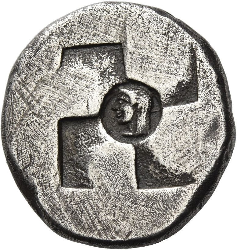 Опис: Голова німфи Аретузи ліворуч, волосся, що спадає з чола, з паралельними пунктирними лініями, в колі, заглибленому в центрі свастики, утвореної з чотирьох частин втиснутого квадрата.