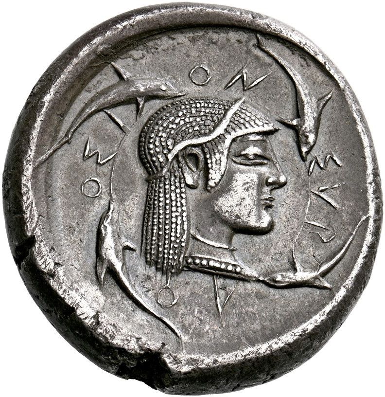 Опис: Голова Аретузи праворуч, волосся пов'язане діадемою, вона носить сережки та намисто з підвісками; точкове обрізання шиї. Навколо чотири дельфіни, що плавають за годинниковою стрілкою.