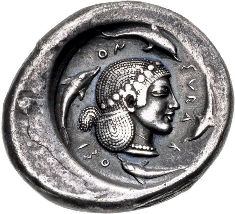 Опис: Голова Аретуси праворуч, в таїнії та перловому намисті; чотири дельфіни та ΣVRA-K-OΣI-ON навколо.