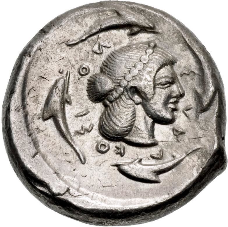 Опис: Голова Аретуси праворуч, в перловій тіані та намисті; Σ-VRA-KOΣI-OИ (R перевернуте) та чотири дельфіни навколо.