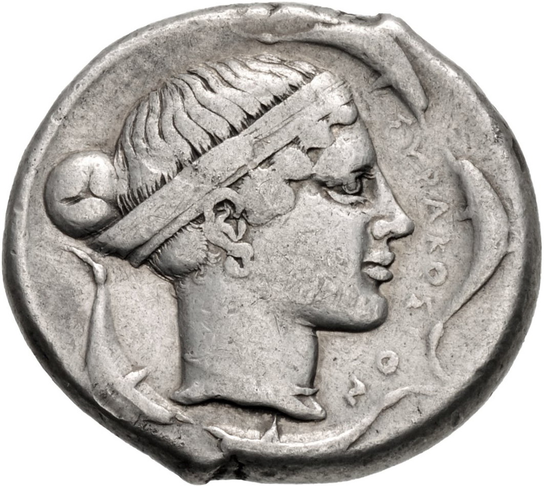 Опис: Голова Аретуси праворуч, в широкій таїнії, з сережкою та намистом; ΣΥΡΑΚΟΣΙΟΝ праворуч, чотири дельфіни навколо.