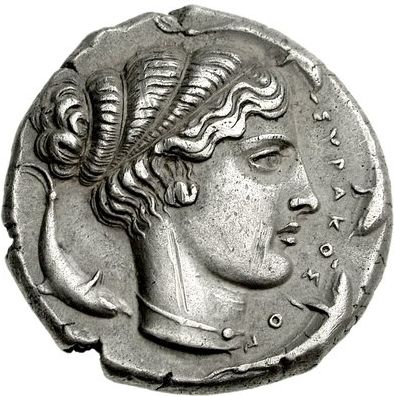 Опис: Голова Аретузи праворуч, волосся пов'язане чотирма стрічками, на шиї намисто; навколо чотири дельфіни та ΣYPA-KO-Σ-ION.