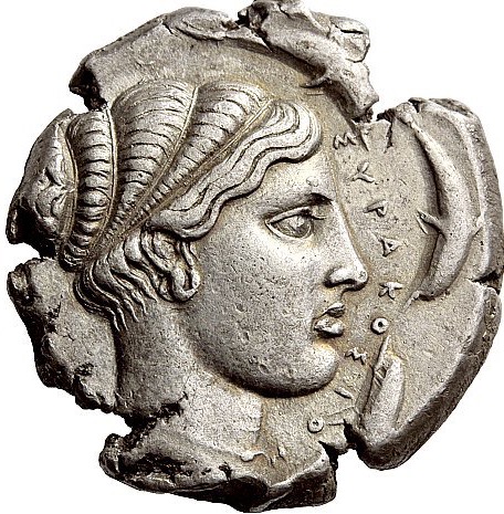 Опис: Велика голова Аретузи праворуч, вона носить прості сережки та намисто з підвіскою, а її волосся пов'язане шнурком, обмотаним чотири рази навколо голови. Навколо — чотири дельфіни.