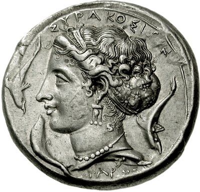 Опис: Голова Аретузи ліворуч, волосся в оздобленій ампиксі, надіта потрійна підвіска та перлове намисто; ΣYPAKOΣIΩN зверху, ΠAPME знизу; чотири дельфіни навколо, один виходить з-під її шиї.