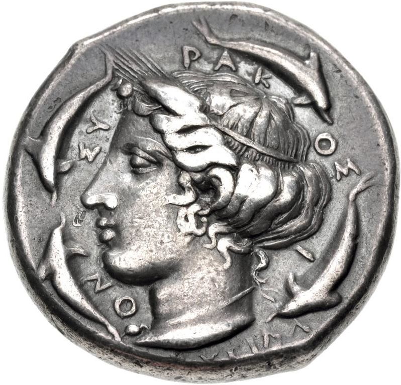 Опис: Голова Аретуси ліворуч, в вінку з колосків, з гачковою сережкою та лінійним намистом з перлинним кулоном; ΦPYΓIΛΛ/OΣ у двох рядках нижче, чотири дельфіни та ΣV-PAK-OΣ-I-ON навколо.
