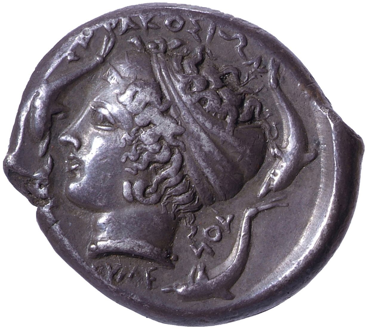 Опис: Голова німфи Аретузи ліворуч, вона носить сфендон і ампикс, прикрашені зірками; під зрізаною шиєю — ім'я гравера. Навколо — чотири дельфіни.