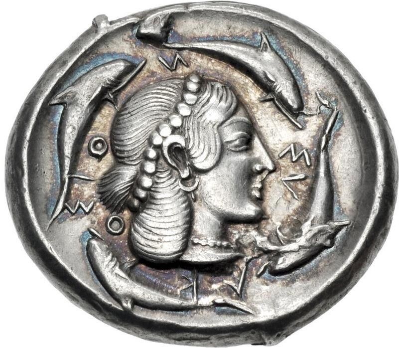 Опис: Голова Аретуси праворуч, в перловій тіані, з однопідвісною сережкою та намистом; ΣV-[R]-AK-O-ΣIO-И та чотири дельфіни навколо.