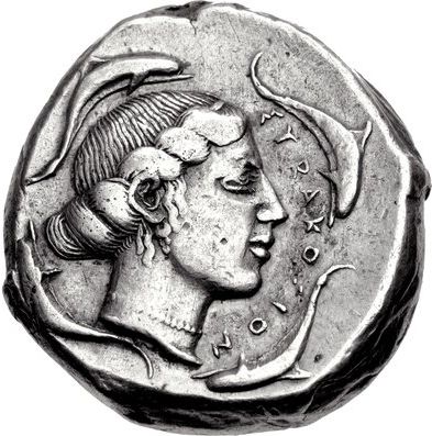 Опис: Голова Аретузи праворуч, волосся в простій стрічці, надіта петльова сережка з одним підвісом і перловим намистом; ΣYRAKOΣION спереду, чотири дельфіни навколо.