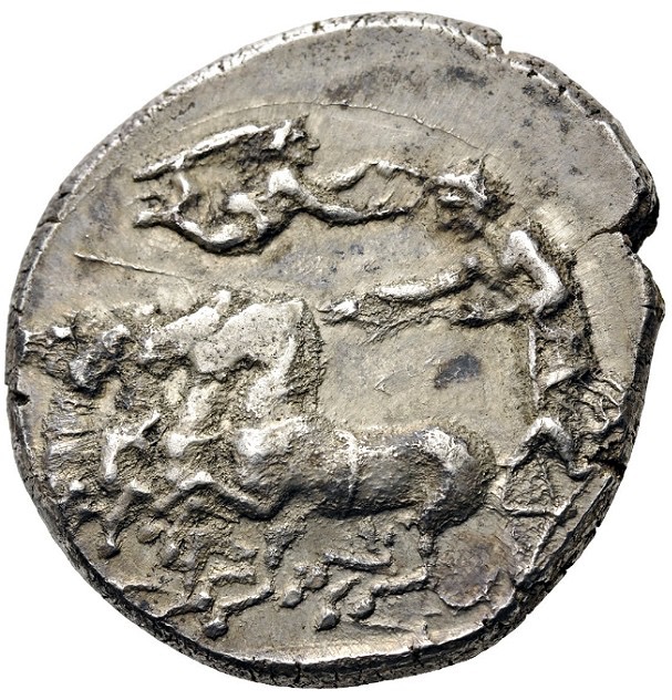 Опис: Квадрига, що мчить ліворуч, керована жінкою-водієм, яка нахилилася вперед, з кентроном у правій руці та віжками в лівій. Зліва вгорі — Ніка, що летить праворуч, щоб увінчати водія, а в екзергу — вівтар.