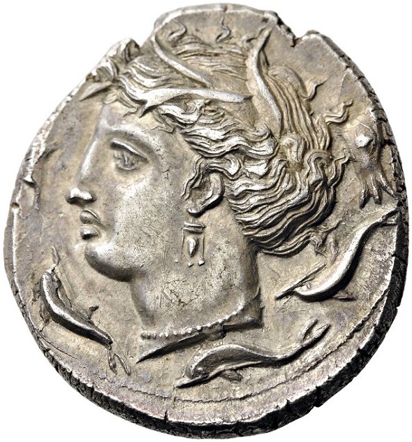 Опис: Голова жінки (Таніт чи Деметра?) ліворуч, в вінку з зерна, з потрійними сережками та намистом. Навколо — чотири дельфіни, що плавають праворуч і позаду голови, ніс корабля.