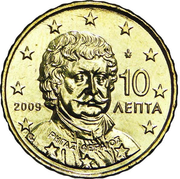 Опис: Портрет Рігаса Фереоса (1757–1798), попередника та провідної фігури грецького просвітництва та конфедерації, супроводжується легендою, що вказує його ім’я «Ρήγας Φεραίος» та номінальну вартість, і оточений дванадцятьма зірками Європи.