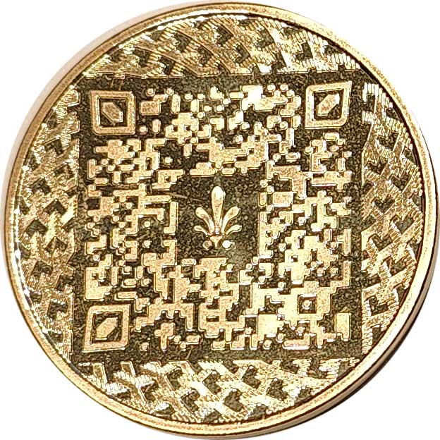 Опис: На монеті зображено дизайн, схожий на QR-код, а в центрі — емблема з стилізованим символом (пальмою) Монетного двору Греції. По краю медалі проходить переплетений візерунок, що створює декоративну рамку. Дизайн пропонує сучасний погляд на поєднання цифрових елементів із традиційною нумізматикою.