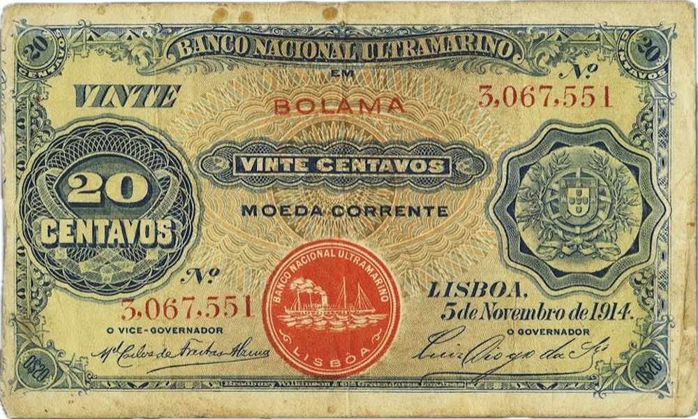 Опис: Темно-синій на багатокольоровому піддруку. Португальський герб праворуч; банківська печатка внизу по центру (два варіанти). Наддрук «BOLAMA» вгорі по центру.