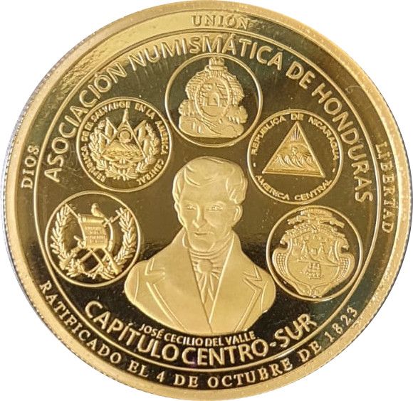 Опис: Зображення національного героя Хосе Сесіліо дель Вальє з його ім'ям під ним. 5 гербів країн Центральної Америки у півколі над його головою. Назва асоціації-емітента у внутрішньому колі. Слова «Dios, Unión, Libertad» у верхньому зовнішньому колі та дата ратифікації пам'ятної монети у нижньому зовнішньому колі.