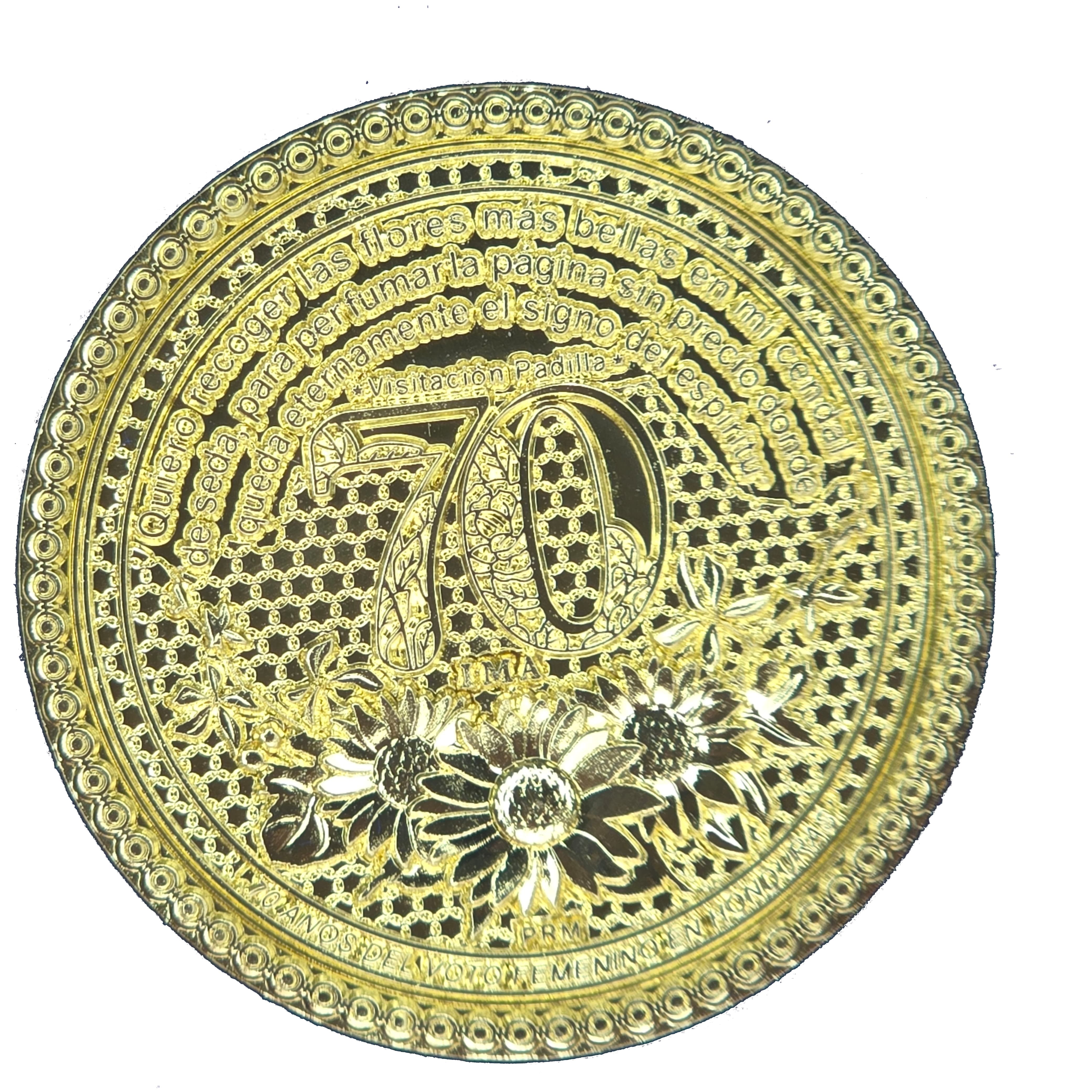 Опис: Велика цифра «70», прикрашена квітковими та філігранними візерунками. Дизайн оточує круглий орнаментальний фон у вигляді мережива. У верхній частині — цитата Вісітасіон Паділья. У нижній частині — квіткова композиція з трьома великими квітами та додатковими філігранними прикрасами.