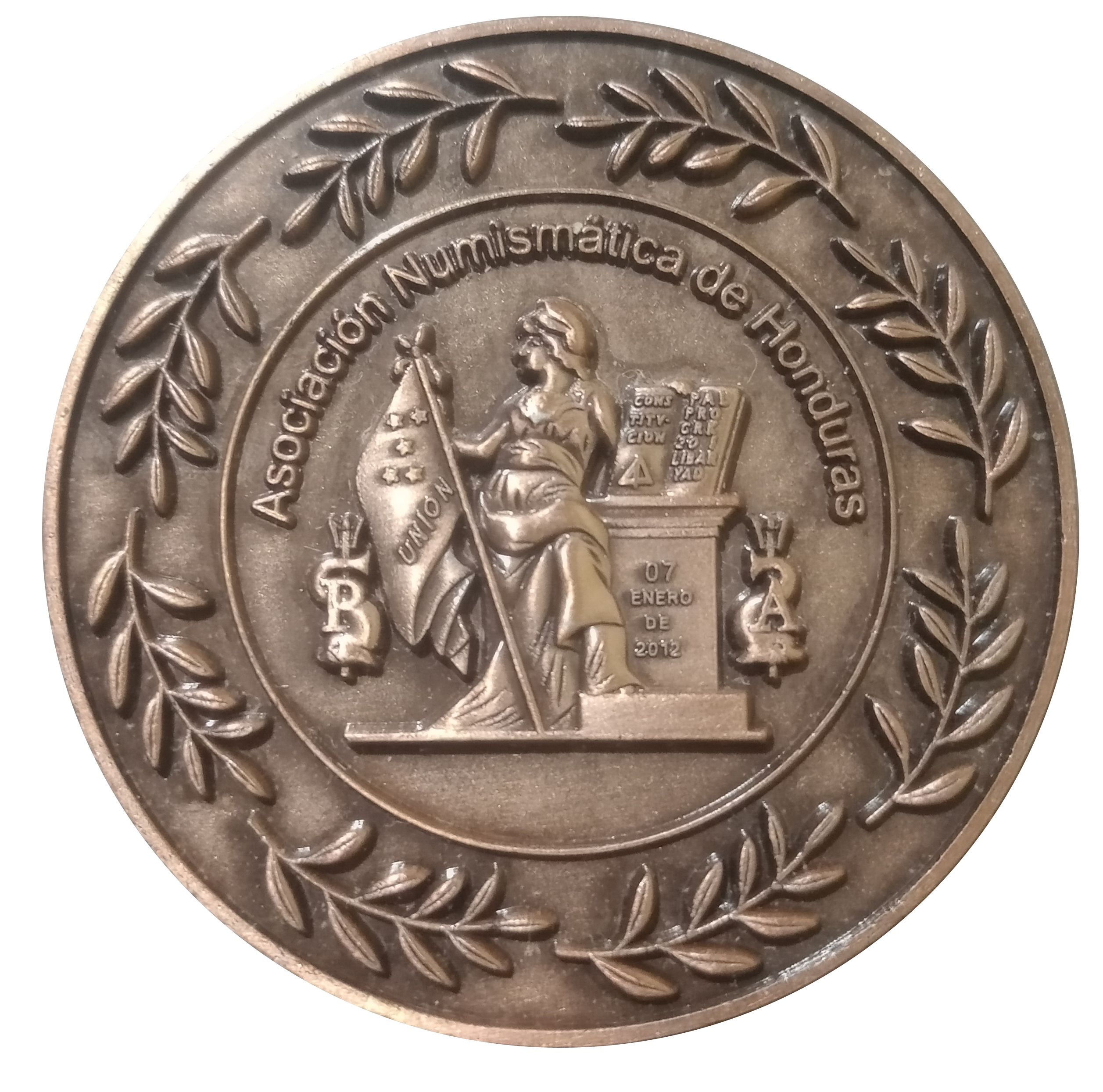 Опис: Рельєф: стояча Свобода, лівою ногою спирається на основу колони, тримає прапор із 5 зірками та написом «UNION»; у лівій руці тримає Конституцію з написами «CONSTITUCIÓN» та «PAZ PROGRESO LIBERTAD»; на колоні напис «27 DE AGOSTO DE 1876»; по боках — тритони та тризуби з літерами «P» та «A». Зверху напис «Asociación Numismática de Honduras». Навколо — лаврові мотиви.