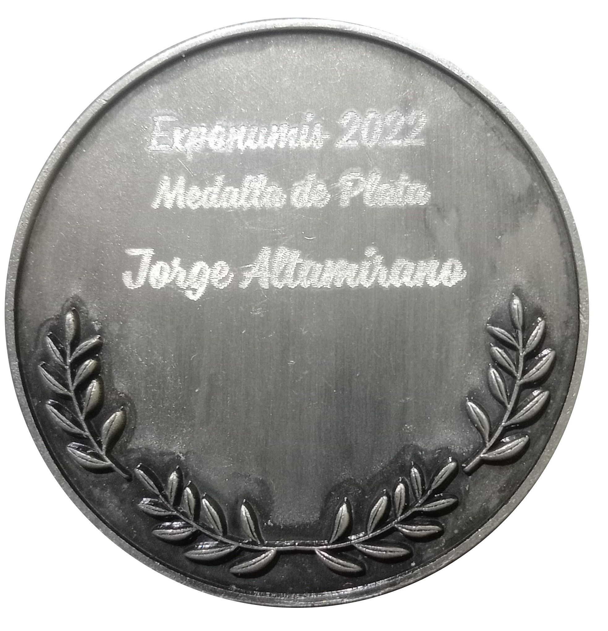 Опис: Матова срібна поверхня з білим написом «Exponumis 2022 – Medalla de Plata – Jorge Altamirano», лаврові гілки внизу.