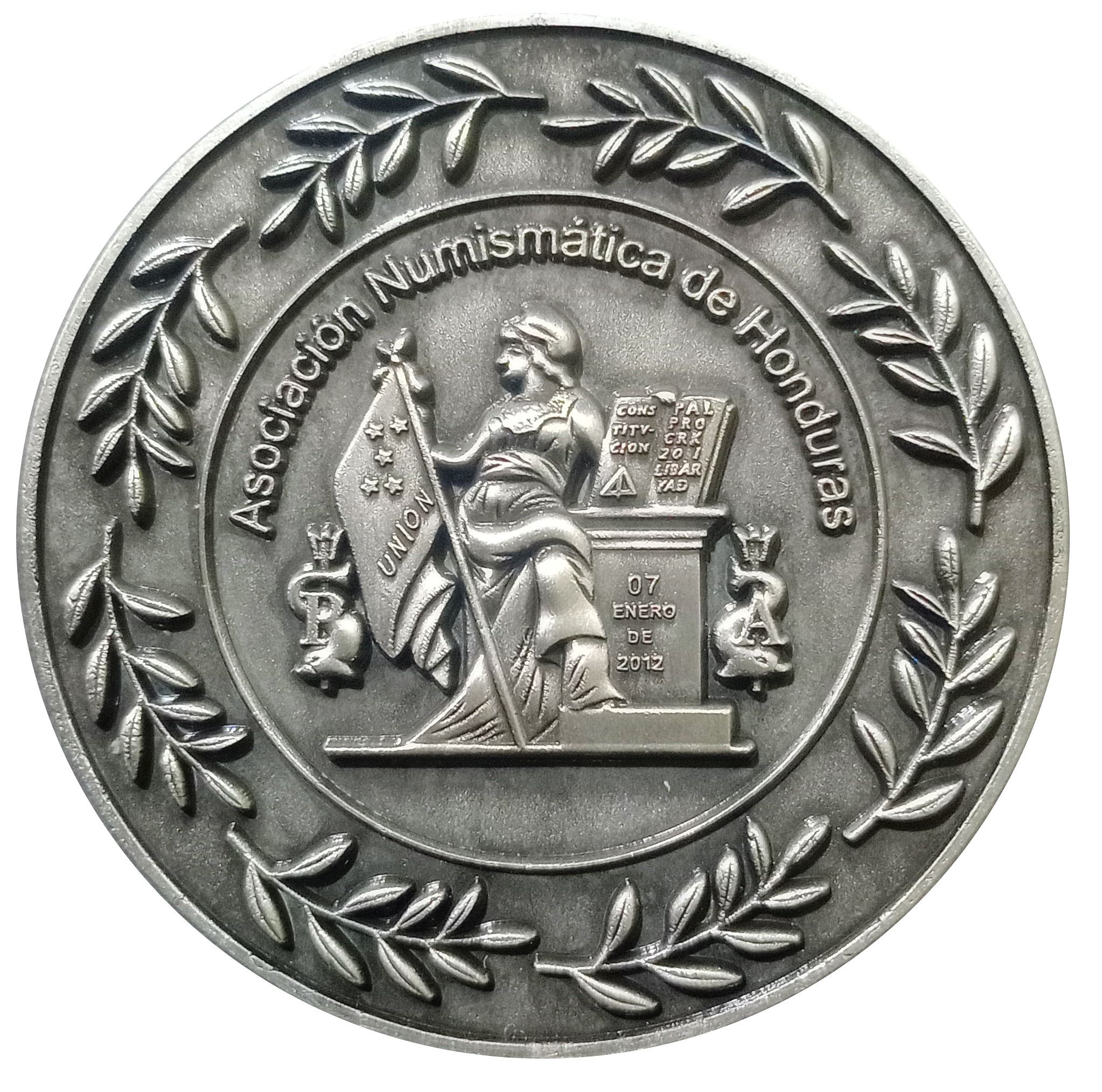 Опис: Рельєф стоячої Свободи з лівою ногою на основі колони, яка тримає прапор з 5 зірками та написом «UNION»; лівою рукою тримає Конституцію з написами «CONSTITUCIÓN» та «PAZ PROGRESO LIBERTAD»; на колоні напис «27 DE AGOSTO DE 1876»; по боках тритони та тризуби з літерами «P» та «A». У верхній частині – «Asociación Numismática de Honduras». Навколо – мотиви лаврового листя.
