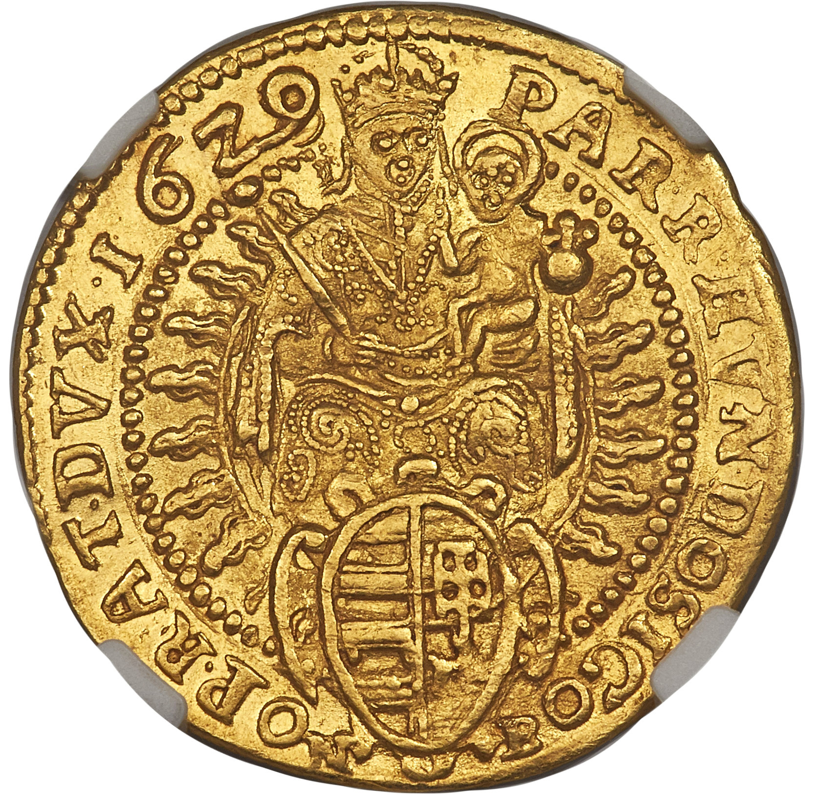 Опис: Мадонна сидить обличчям до глядача в мандорлі, тримаючи скіпетр і Святе Дитя, яке тримає державу; нижче прикрашений герб.
