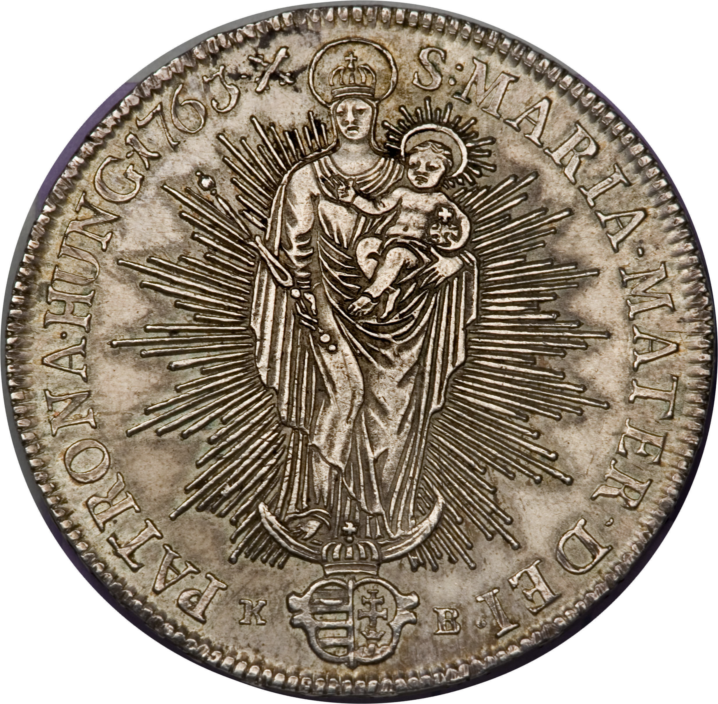 Опис: Промениста коронована і прославлена Мадонна з дитиною на лівій руці стоїть на півмісяці з прикрашеним подвійним угорським гербом внизу. Монетний знак внизу розділений щитом.