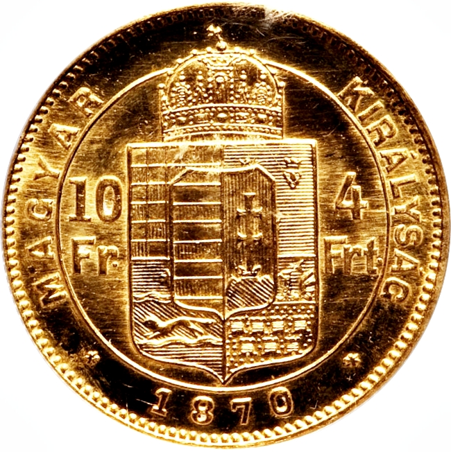 10 франків / 4 форинтів — Франц Йосиф I 1870 – 1880 Угорщина