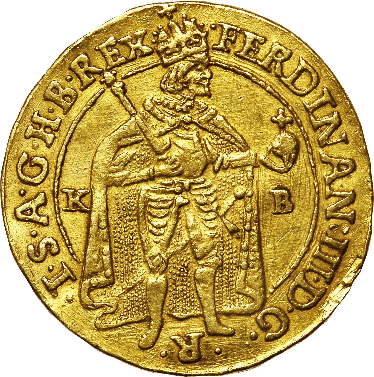 Опис: Повна фігура Фердинанда в короні, що стоїть праворуч у мантії, зі скіпетром і державою, розділена знаком монетного двору KB. Навколо — легенда.