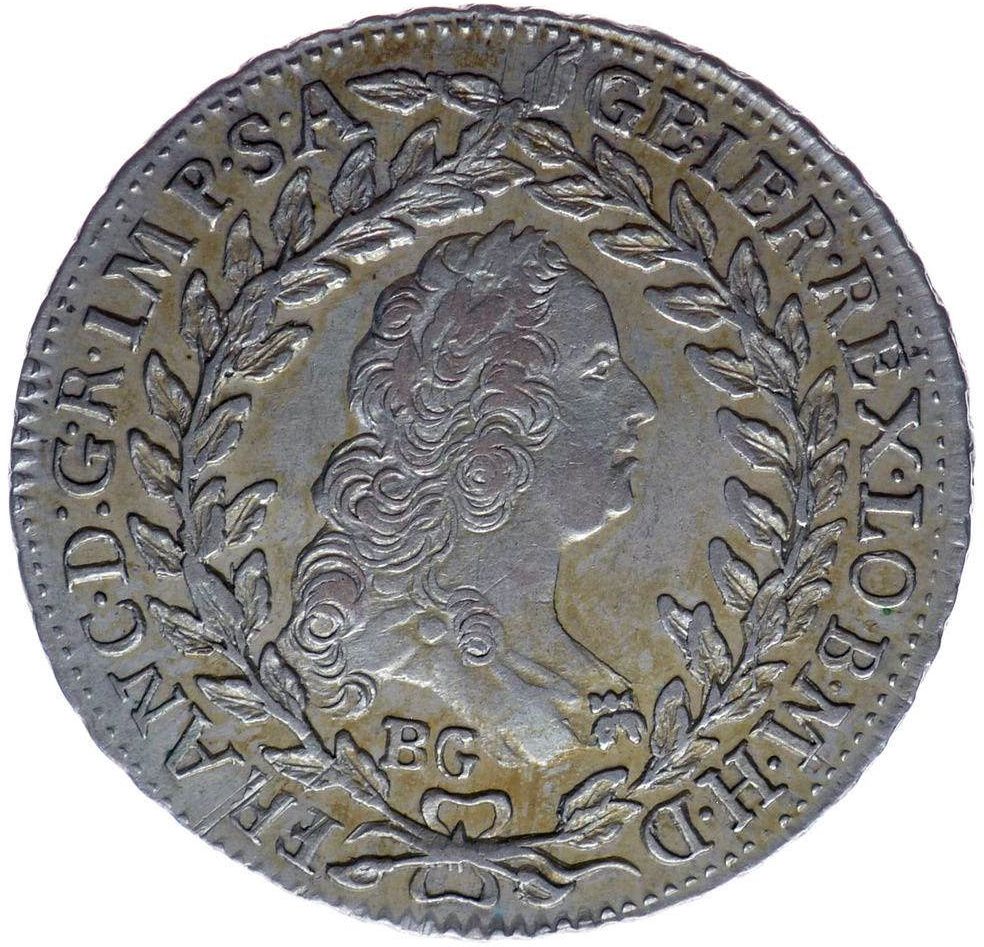 Опис: Коронований двоголовий орел на п'єдесталі з номіналом, оточений гілками. На грудях — герби Лотарингії та Тоскани з орденом Золотого руна. П'єдестал розділяє знак монетного майстра. (див. коментарі)