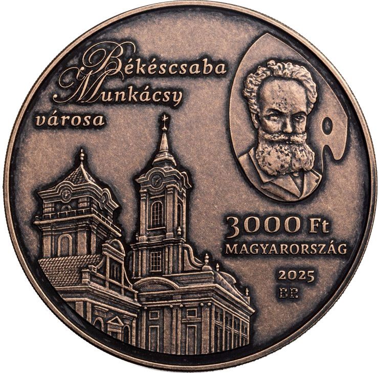 Опис: На лицьовій стороні праворуч вгорі зображено портрет Мункачі в палітрі художника, а ліворуч від нього у три горизонтальні рядки викарбувано девіз повіту: «Békéscsaba Munkácsy városa» (Бекешчаба, місто Мункачі). У нижньому лівому куті зображені Мала лютеранська церква та Велика лютеранська церква Бекешчаби, оскільки досить незвично, щоб місто мало дві церкви на головній площі. Обов'язкові елементи, а саме номінал «3000 Ft», емітент «MAGYARORSZÁG», рік випуску «2025» та знак монетного двору «BP.», розміщені праворуч від церков у чотири рядки.