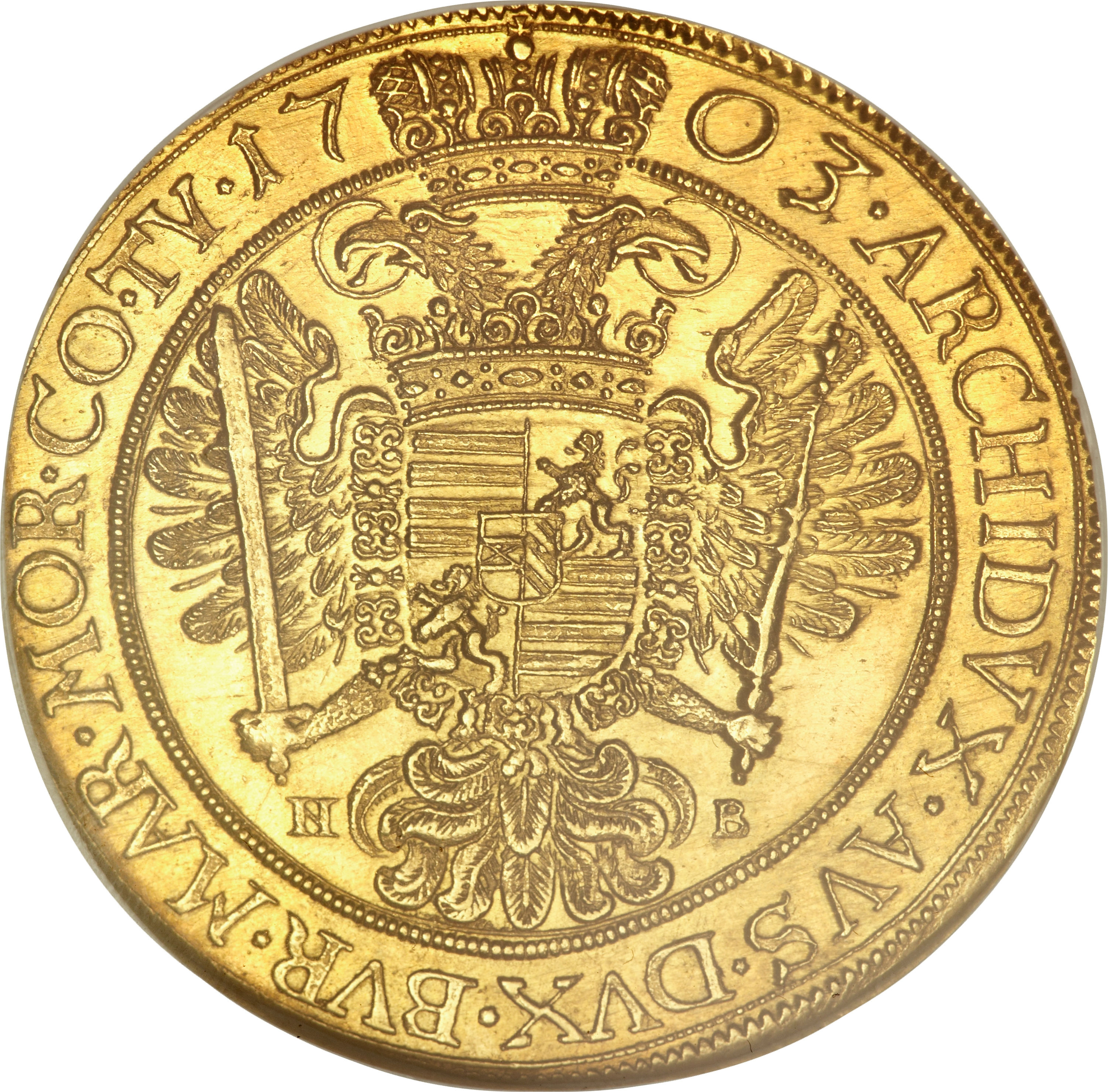 Опис: Коронований імперський орел у внутрішньому колі, корона розділяє дату вгорі, N B розділене хвостом орла. Коронований чотирикратний (арпадські смуги — богемський лев — арпадські смуги — богемський лев) герб у картуші у формі літери U. Некоронований австрійський та бургундський герб у центральному щиті.