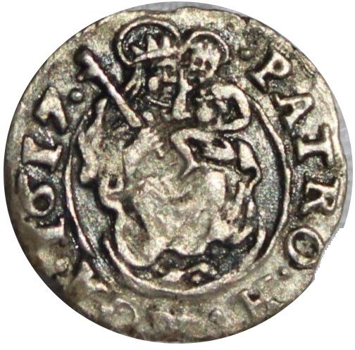 Опис: Коронована і не прославлена, не сяюча Мадонна сидить, тримаючи дитину на лівому руці, а хрест — на правому. Без півмісяця.