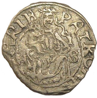 Опис: Коронована Мадонна, що сидить з дитиною на правій руці, розділяє знак монетного двору.