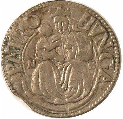 Опис: Коронована Мадонна з дитиною на правій руці, розділяє знак монетного двору NB (Надьбаня)