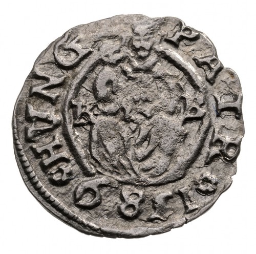Опис: Коронована Мадонна з дитиною праворуч, роздільна монетна марка, дата в круговій легенді