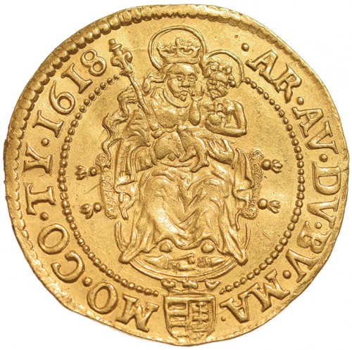 Опис: Непромениста коронована і прославлена Мадонна з дитиною на лівому руці і скіпетром у правій руці на подушці. Нижче — коронований угорський подвійний щит.
