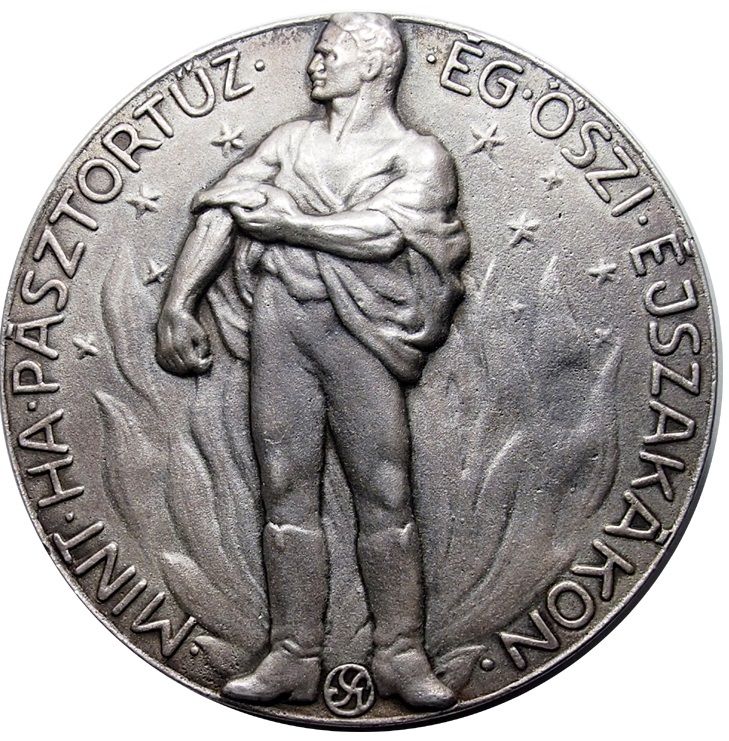 Опис: Постать Міклоша Толді (з найвідомішого твору Арані) стоїть на передньому плані, за нею — вогонь пастухів і зірки; напис навколо: цитата з «Толді»