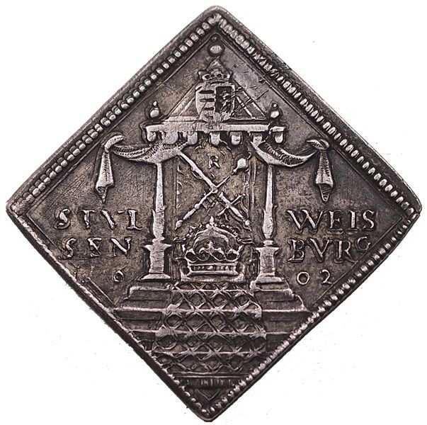 Опис: У верхній частині трону — угорський щит з гербом, нижче нього між колонами — глечик, меч та угорська Священна корона; розділяє напис