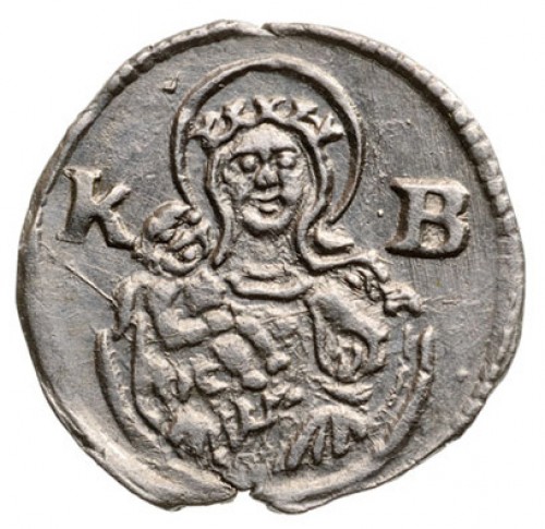 Опис: Коронована і прославлена Мадонна з дитиною на правій руці на півмісяці розділяє знак монетного двору.