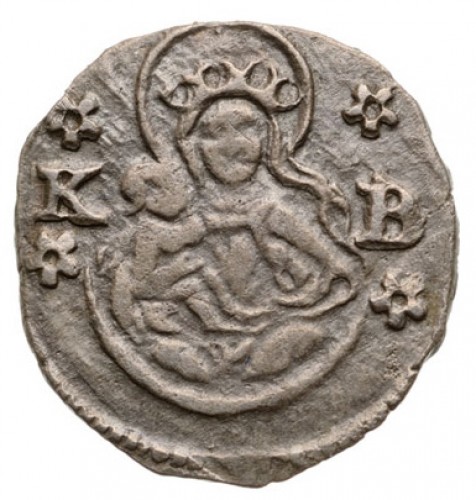 Опис: Коронована і прославлена Мадонна, що сидить на півмісяці, з дитиною на правій руці, розділяє монетний знак K-B.