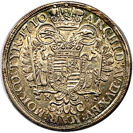 Опис: Коронований імперський орел у внутрішньому колі, марка монетного двору K B, розділена хвостом орла, між головами орла немає імператорського яблука. Чотирикратний коронований герб (смуги Арпада — богемський лев — смуги Арпада — богемський лев) у картуші у формі літери U. Некоронований герб Австрії та Бургундії в центрі щита.