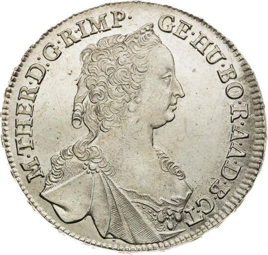 Опис: Бюст праворуч, легенда «Марія Терезія, Dei Gratia Romanorum Imperatrix, Hungariae Bohemiaeque Regina, Archidux Austriae, Dux Burgundiae, Comes Tyrolis» GE · HU · BO · в легенді