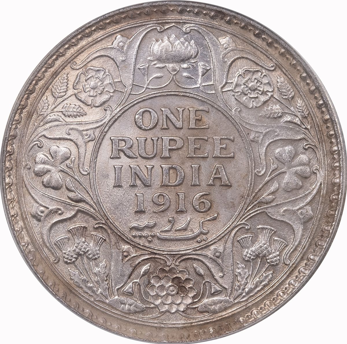 Опис: Усередині кола дата розділяє напис англійською та урду (Yek Rupya), а зовні кола зображено вінок з троянд, чортополоху, листя конюшини та квітів лотоса, все це в зубчастій рамці.
