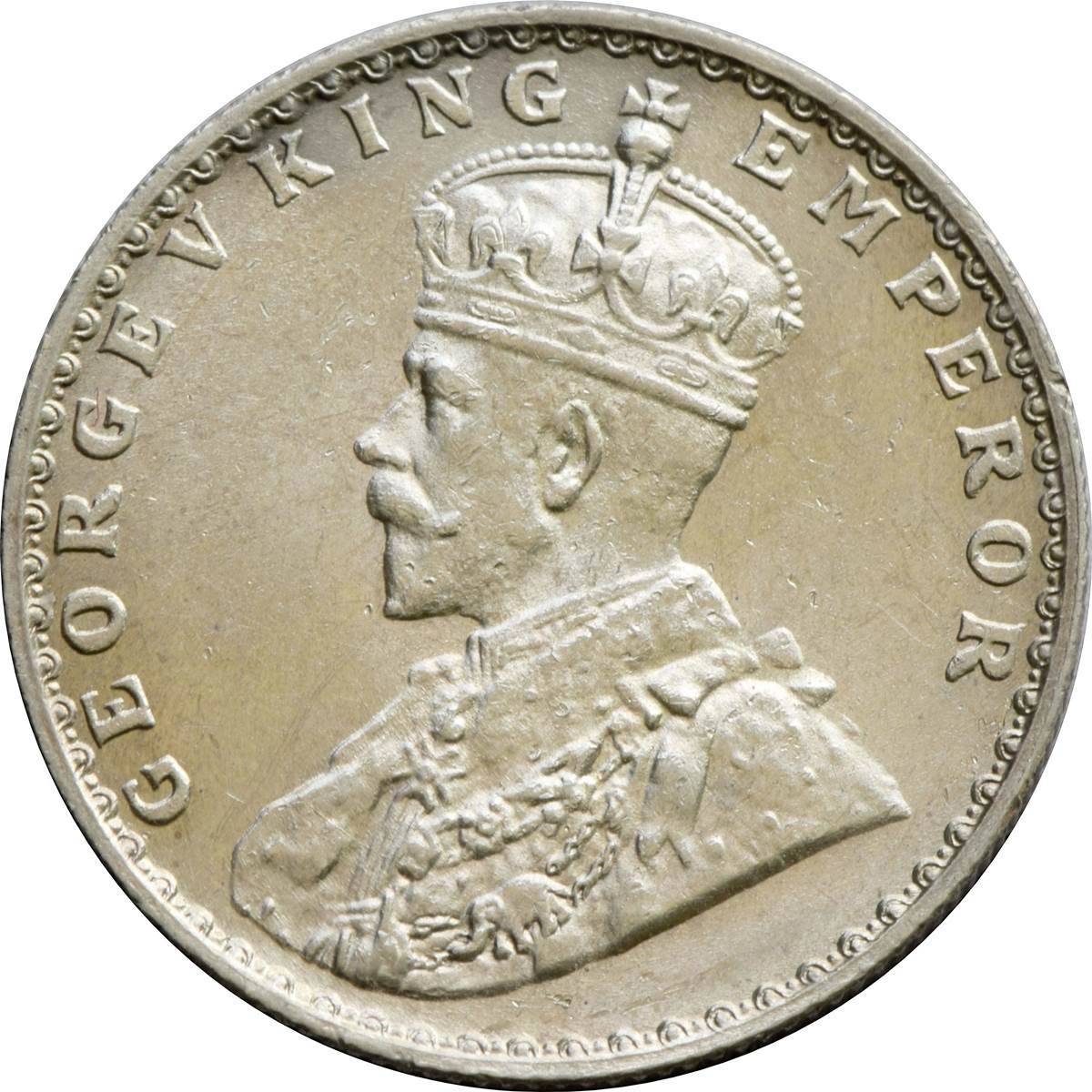 Опис: Коронований бюст короля Георга V (тип II) із зображенням слона на мантії короля, звернений ліворуч.