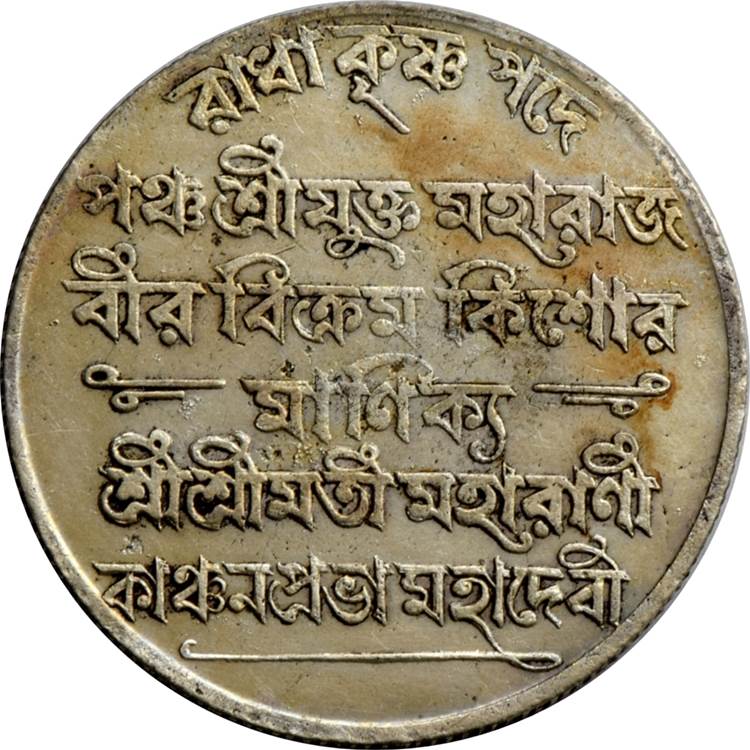 Опис: Легенда на бенгальській мові: Радха Крішн Падх (вигнуті літери вгорі) Панч Шрі Юкта Махарадж Вір Вікрам Кішор Манікя (між паралельними лініями) Шрі Шріматі Махарані Канчан Прабха Махадеві