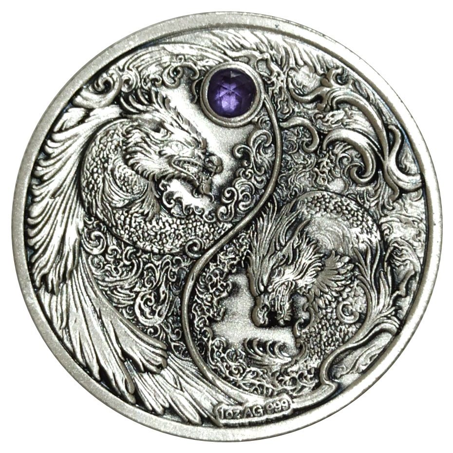 Опис: На аверсі цієї срібної монети зі складним дизайном зображено двох величних драконів, що переплітаються в динамічній формі Інь-Ян, що символізує рівновагу, подвійність і космічну гармонію в традиційній східній філософії. Кожен дракон вишукано деталізований з текстурованими лусками, хвилястими гривами та грізними виразами обличчя, що підкреслює як силу, так і елегантність.